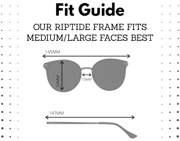 Fit Guide: Our Riptide frame fits Medium/Large faces best. Measurements shown on the fit guide: 145mm frame width, 54mm lens height, 10mm bridge, 147mm arm length.